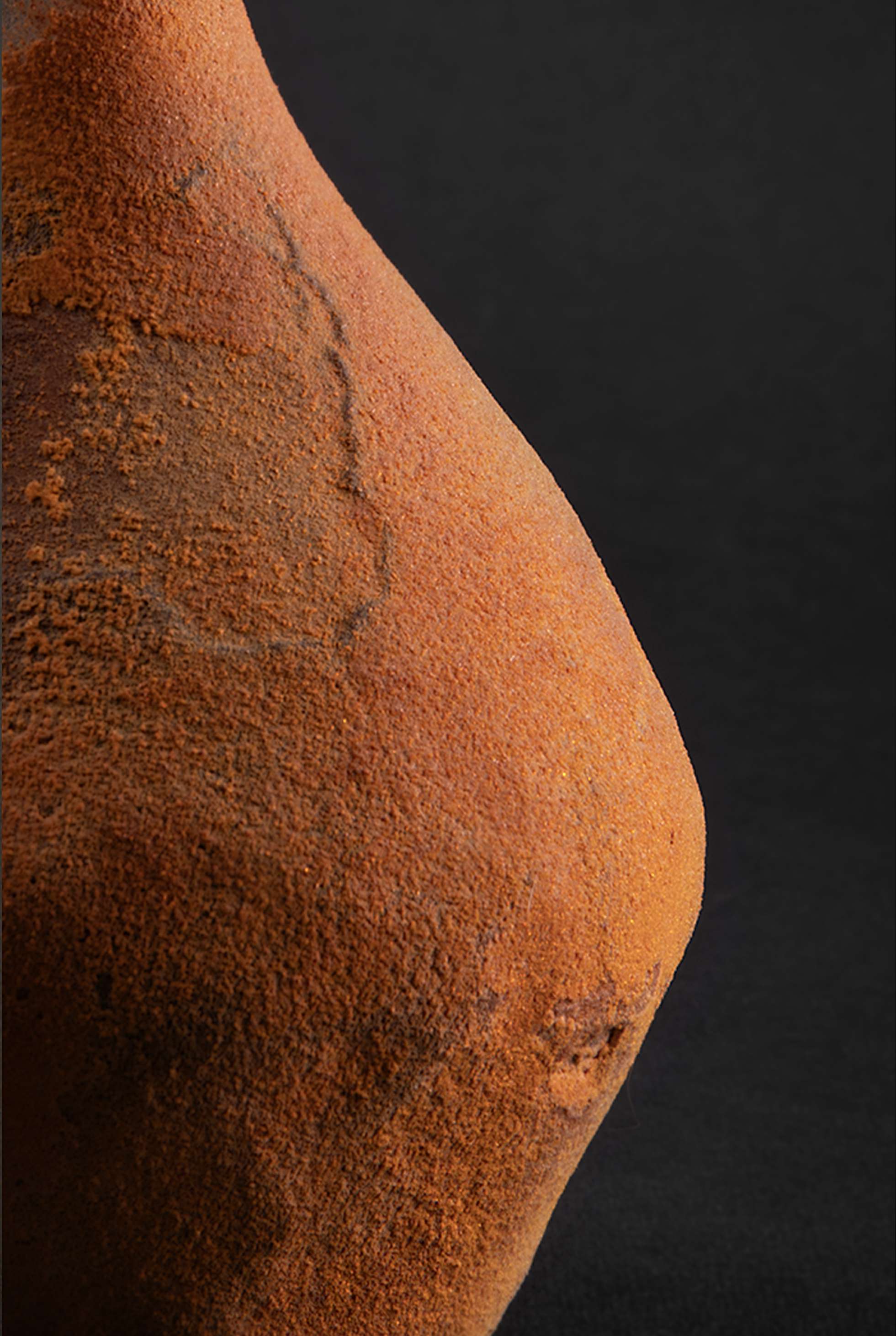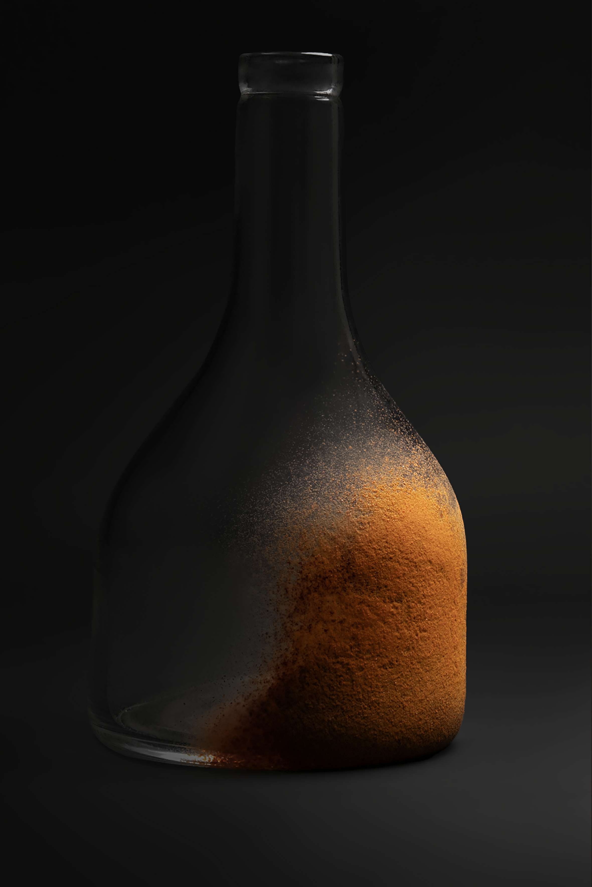 Bouteilles, jarres et fioles affichent ainsi la palette mordorée de la décomposition. Dans leur diversité, élancées ou tassées, elles composent un paysage de silhouettes humaines, des enveloppes charnelles et éphémères, lentement consumées par le temps.