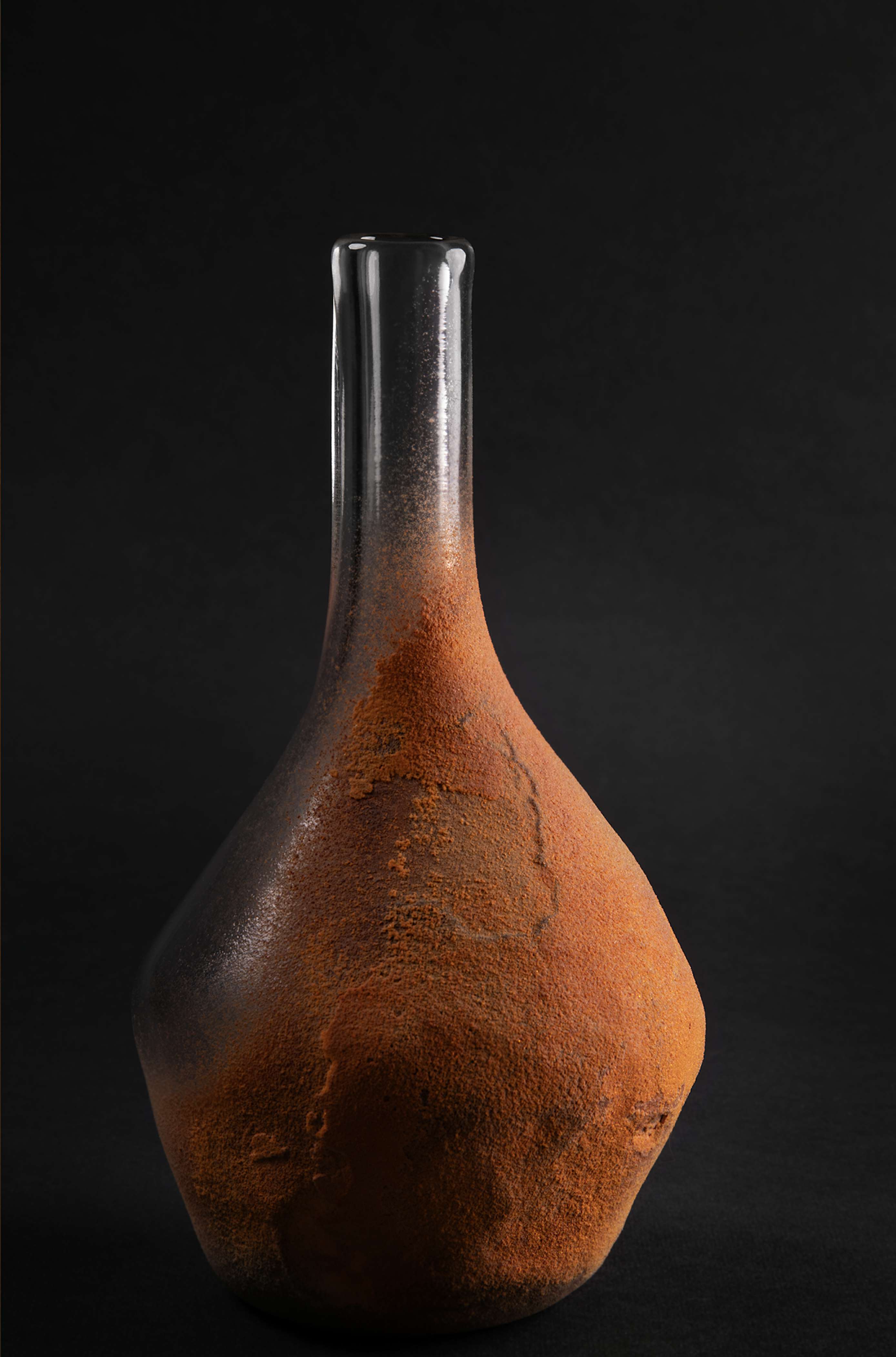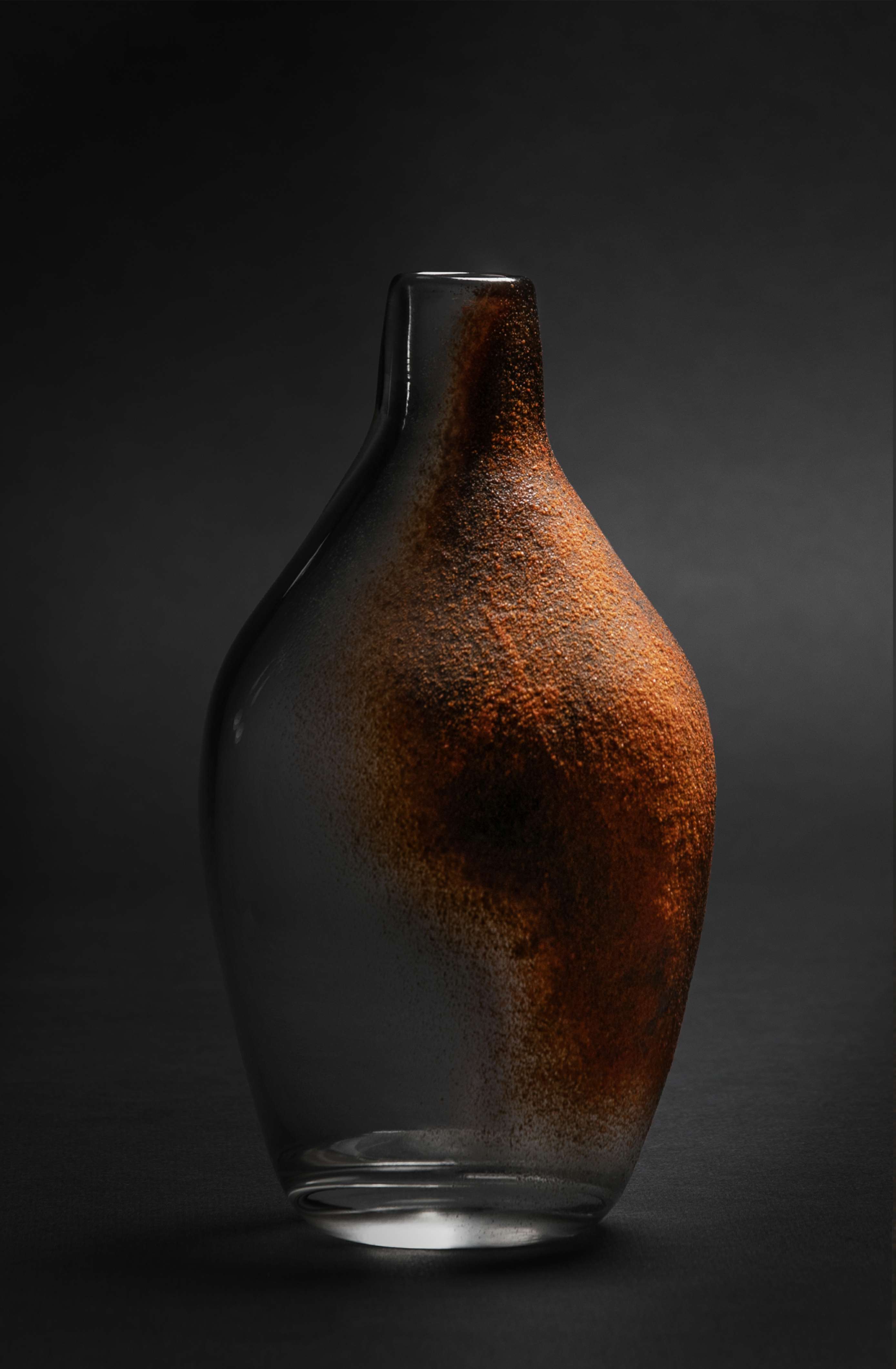 Crystal clear bottles and flasks with various sizes and shapes, are covered by a rusty-like glass powder pattern, and partially gnawed by acid etching and sandblasting. This technique creates a landscape of human silhouettes, short-lived bodies gently consumed by time.
